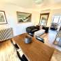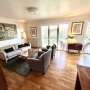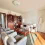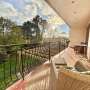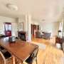 Au premier niveau se trouve une grande et lumineuse pièce de vie, sublimée par un parquet en chêne massif et dotée d’une cheminée fonctionnelle dans la partie salle à manger, le tout ouvrant sur un balcon, exposé sud, offrant une vue sur le jardin boisé.